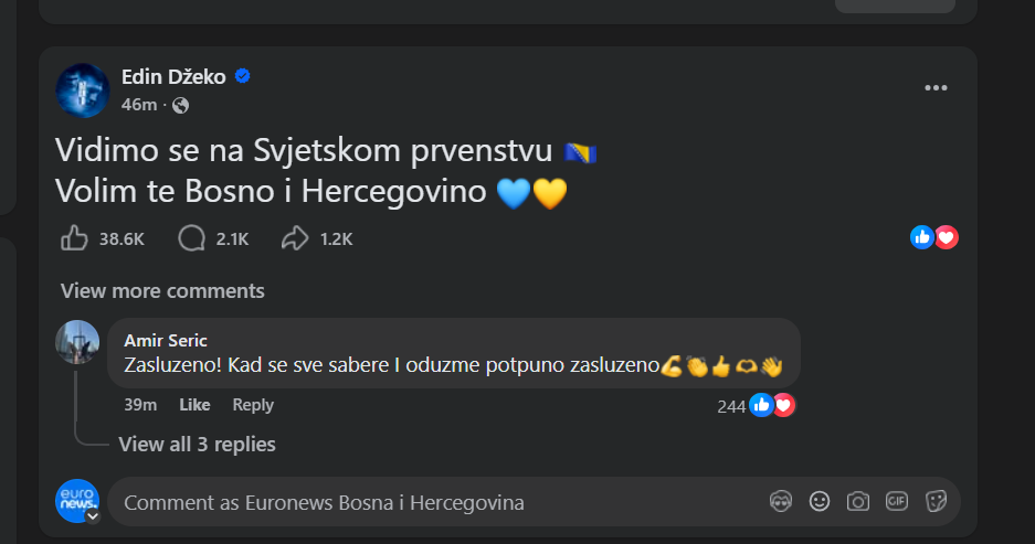 Kapiten reprezentacije Bosne i Hercegovine Edin Džeko oglasio se na društvenim mrežama poslije velikog uspjeha.