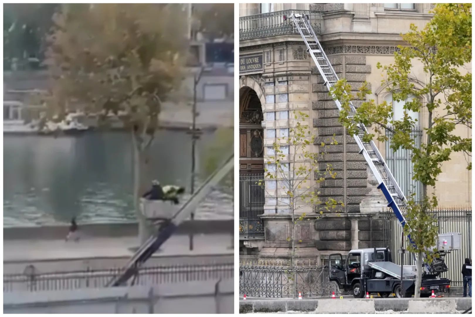 Na videu koji traje 36 sekundi, čiju je autentičnost potvrdio list Le Parisien, vide se dvojica muškaraca odjevenih u crno kako se vanjskim teretnim dizalom polako spuštaju iz galerije Apollo. Jedan od njih nosi žuti reflektirajući prsluk, a drugi motociklističku kacigu. Čini se da je video snimljen s obližnjeg prozora u muzeju, s pogledom na Quai François Mitterrand, gdje su lopovi prethodno parkirali ukradeni kamion s 30-metarskim merdevinama koje su iskoristili za ulazak u galeriju na prvom spratu.