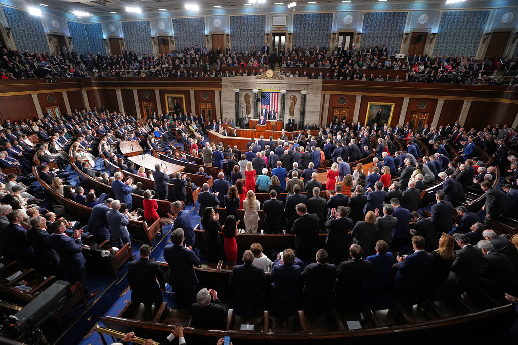 „Naša nacija se vratila – veća, bolja, bogatija i jača nego ikad prije“, rekao je nakon što se popeo na binu uz uzvike „SAD, SAD“ od strane svojih kolega republikanaca u Kongresu, dok su desetine praznih mjesta na demokratskoj strani podsjećale da su mnogi zakonodavci bojkotovali govor u korist antitrampovskih skupova ispred zgrade.