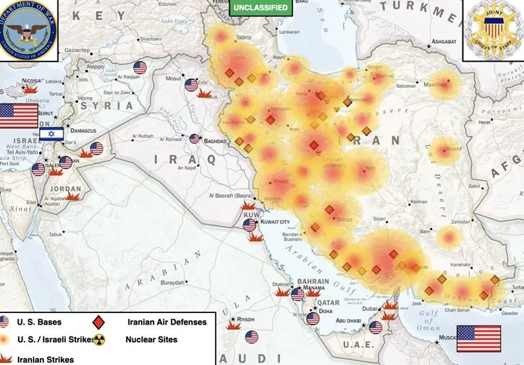 Američko ministarstvo odbrane objavilo je na društvenim mrežama kartu koja prikazuje udare izvedene tokom prvih deset dana rata.