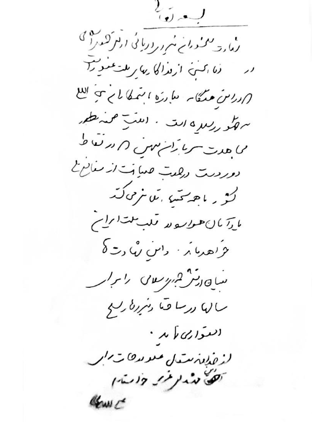 Na Telegram kanalu koji se pripisuje Aliju Larijaniju nedugo nakon najava objavljena je rukom pisana poruka povodom sprovoda poginulih pripadnika iranske mornarice.